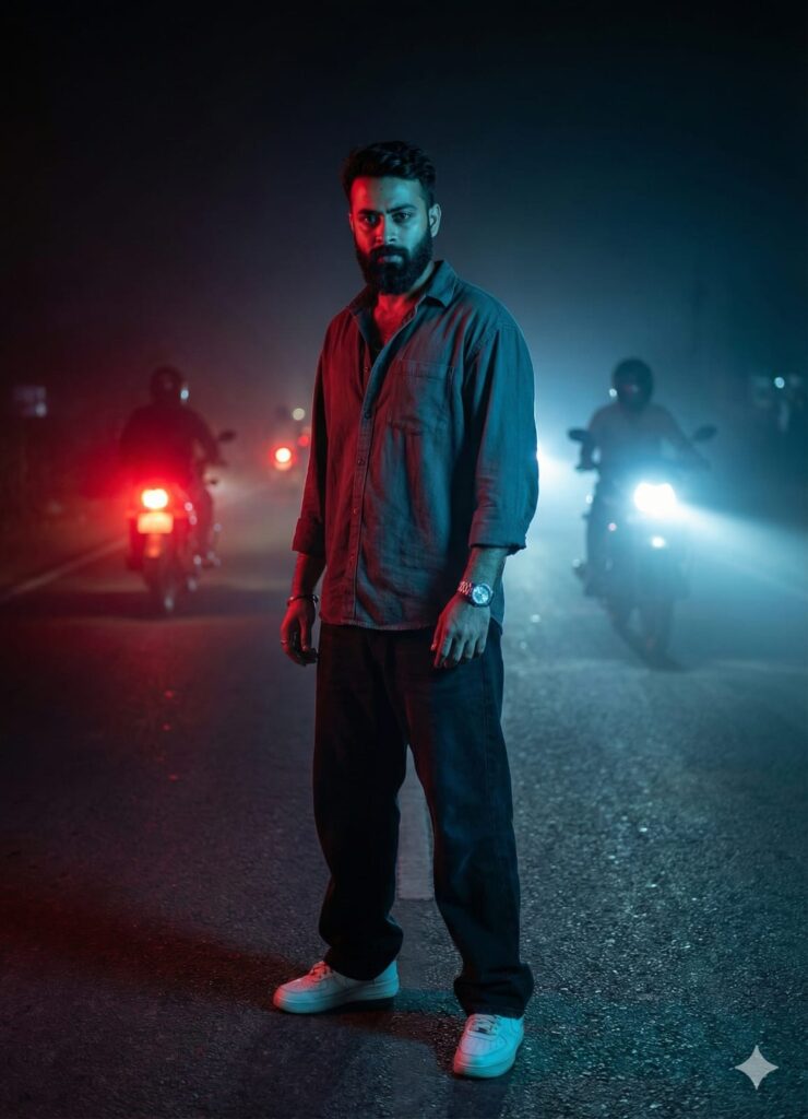 "A hyper-realistic cinematic shot of a handsome young man standing in the middle of a dark main road at night. He has a serious, intense expression and is looking directly into the camera. He is wearing stylish casual streetwear: an oversized loose shirt, baggy jeans, sneakers, and a wristwatch. In the background, motorcycles are approaching from behind with their headlights glowing. The scene has a 'Stranger Things' aesthetic with dramatic dual-tone lighting: a mix of ominous red and neon blue fog lights surrounding him. The lighting is focused sharply on his face, highlighting his features. 8k resolution, highly detailed, photorealistic." Don't change faces