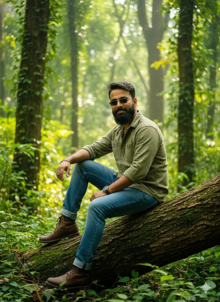 "A hyper-realistic, high-detail portrait of a young man in his mid-20s, with a uniquely appealing, realistic face. He is sitting casually on a thick, fallen tree log, looking directly at the viewer with a slight smile. He is wearing blue jeans, a free-size casual shirt, shoes, sunglasses, and a watch. The background is a dense jungle with large trees, illuminated by natural, bright green forest light. Cinematic lighting, 8k, photorealistic." Don't change faces