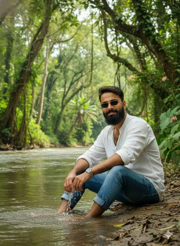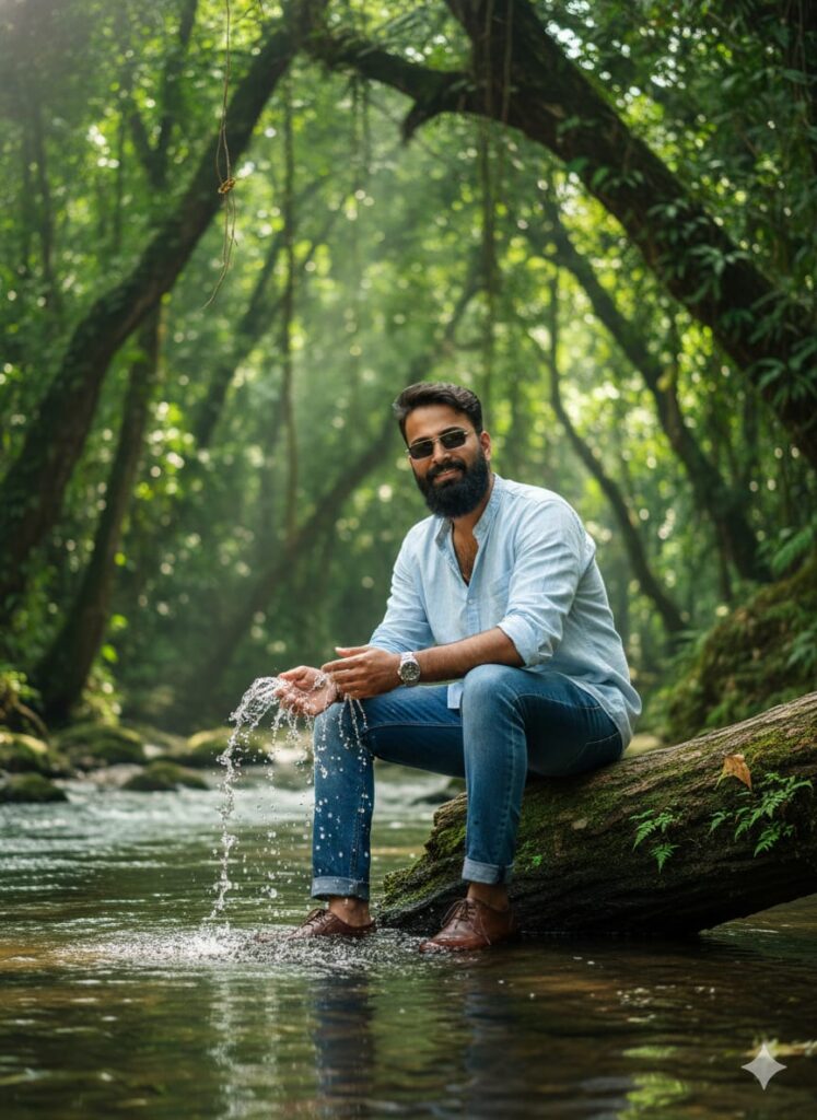 "A hyper-realistic, high-detail portrait of a young man in his mid-20s, with a uniquely appealing, realistic face. He is sitting on a riverbank within a dense jungle, looking directly at the viewer with a slight smile, while playfully splashing the water with his hands. He is wearing blue jeans, a free-size casual shirt, sunglasses, and a watch. The background features many large, lush jungle trees. Natural, bright green forest light illuminates the scene. Cinematic lighting, 8k, photorealistic." Don't change faces