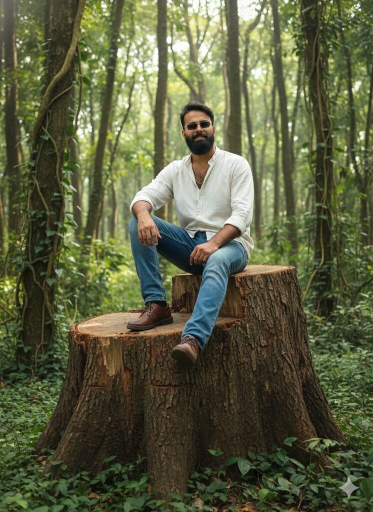 "A hyper-realistic, high-detail portrait of a young man in his mid-20s, with a uniquely appealing, realistic face. He is sitting casually on a thick, chopped-down tree stump, looking directly at the viewer with a slight smile. He is wearing blue jeans, a free-size casual shirt, and shoes, with sunglasses on. The background is a dense jungle with large trees, illuminated by natural, bright green forest light. Cinematic lighting, 8k, photorealistic." Don't change faces