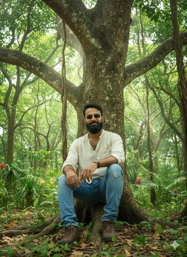 "A hyper-realistic, high-detail portrait of a young man in his mid-20s, with a uniquely appealing, realistic face. He is sitting under a large tree in a dense jungle, leaning comfortably against the tree trunk, looking directly at the viewer with a slight smile. He is wearing blue jeans, a free-size casual shirt, shoes, sunglasses, and a watch. The background features many large, lush jungle trees. Natural, bright green forest light illuminates the scene. Cinematic lighting, 8k, photorealistic." Don't change faces