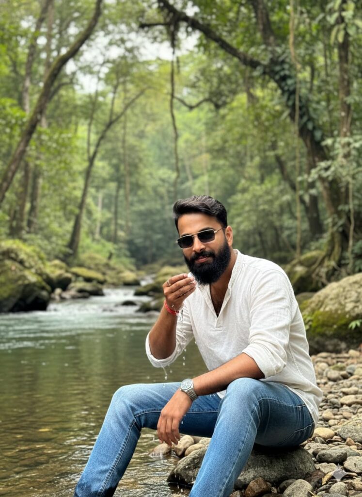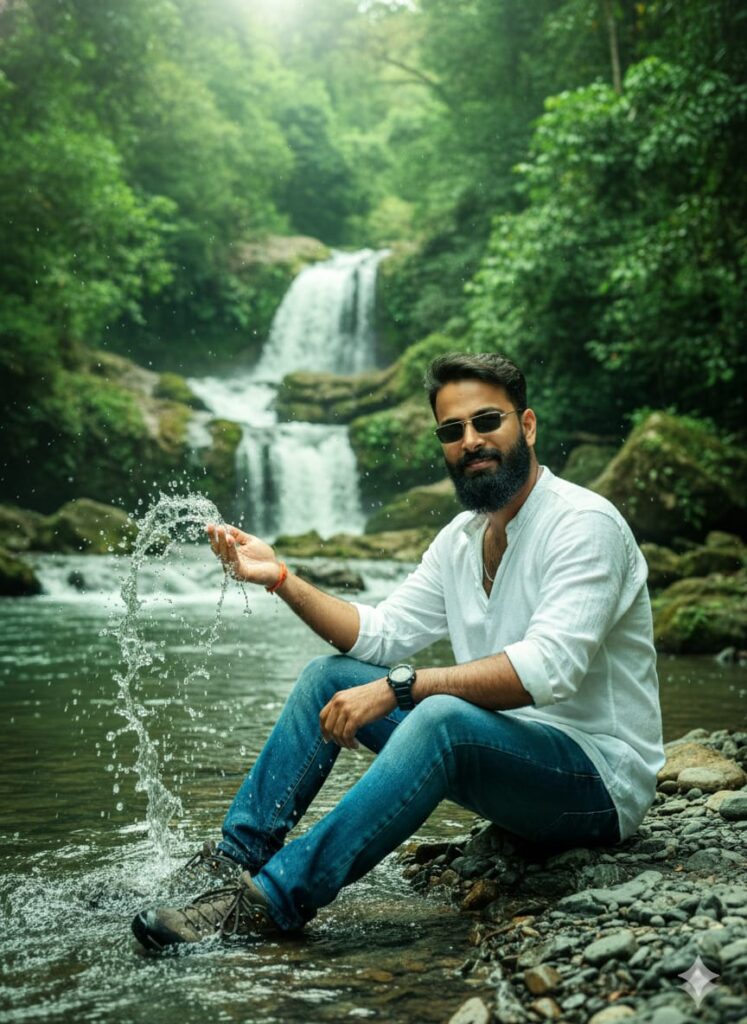 "A hyper-realistic, high-detail portrait of a young man in his mid-20s, with a uniquely appealing, realistic face. He is sitting on small stones at the edge of a flowing river in a dense jungle, looking directly at the viewer with a slight smile and a confident 'full attitude'. He is actively splashing river water with one hand. He is wearing blue jeans, a free-size casual shirt, shoes, sunglasses, and a watch. The background features many large, lush jungle trees and a visible waterfall with water cascading down. Natural, bright green forest light illuminates the scene. Cinematic lighting, 8k, photorealistic." Don't change faces