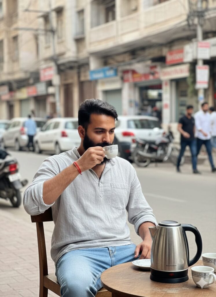 A hyper-realistic and cinematic image of a handsome young man, 20-25 years old, casually dressed in a *white shirt* and jeans. He is wearing a wristwatch on one hand and holding a cup of tea (chai) in the other. He is also wearing stylish shoes. He is seated on a chair on a main road, enjoying his tea with a slight, gentle smile on his face. In the background, there is a roadside tea stall (tapri) with a few other people sitting and drinking tea. The scene features natural, realistic cinematic lighting and is rendered in high-definition (HD) quality. The final image should be absolutely lifelike and feel like a real photograph. Don't change faces