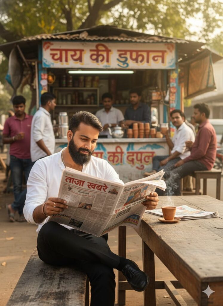"A young, handsome man with a realistic, slightly altered (unique) face sits at a long table by the roadside. He is dressed in a casual yet formal style: formula (dress) pants and a white shirt. He is reading a newspaper with a cup of chai (tea) placed next to him on the table. In the background, there is a traditional tea stall (Chai Ki Dukan) with people drinking tea inside. The image should feature cinematic lighting, a natural and realistic feel, and be rendered in ultra-detailed HD quality." Don't change faces