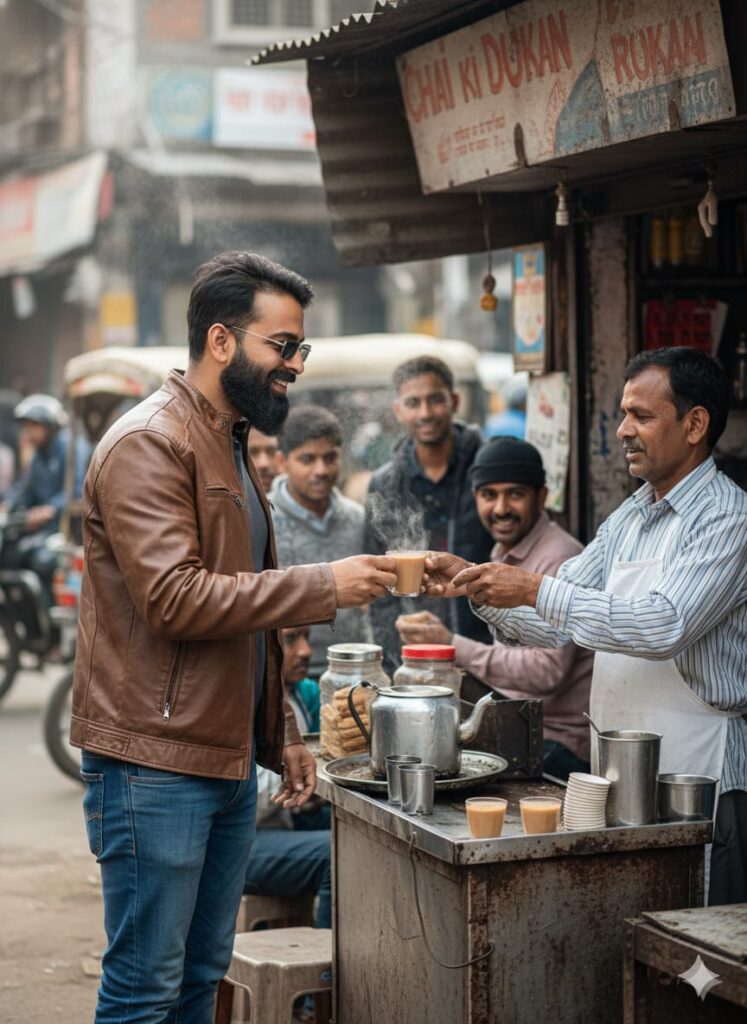 "A handsome young man, dressed casually in jeans, a shirt, and a jacket, is actively receiving a cup of tea from a vendor at a roadside tea stall. The moment should capture the exchange of the tea cup. In the background, the bustling tea stall (Chai ki dukan) is visible with several people inside enjoying their tea. The image must be hyper-realistic, HD quality, utilizing cinematic lighting to create a natural and genuine atmosphere. The young man's face should appear realistic and genuinely engaging." Don't change faces
