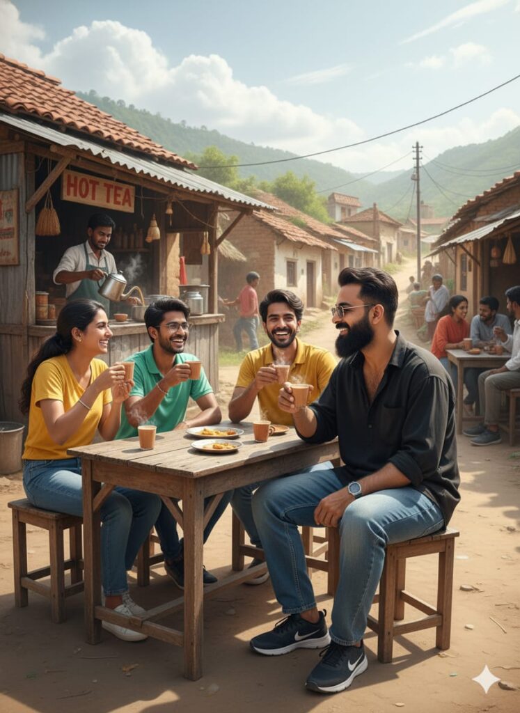 A hyper-realistic and cinematic image of a handsome young man, 20-25 years old, casually dressed in a free-size jeans and a *black shirt. He is wearing a wristwatch and **sports shoes. He is seated at a table with **many friends*, all of whom are drinking tea. In the background, there is a picturesque village scene with a bustling tea stall (chai ki dukan) where tea is being served, and several other people are also seated, enjoying their tea. The scene should feature natural, realistic cinematic lighting and be rendered in high-definition (HD) quality. The final image should look absolutely authentic and lifelike, capturing a vibrant and social village atmosphere. Don't change faces