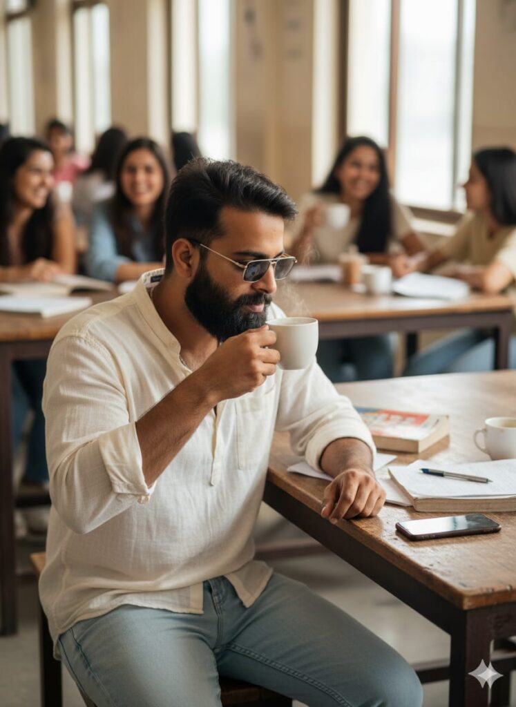 A photorealistic image of a handsome young man with a subtly changing facial structure (or: a realistic, morphing face), wearing a casual outfit consisting of jeans and a loose-fitting shirt. He is seated at a table in a college canteen, drinking a cup of tea. In the background, other girls are visible, enjoying themselves. Cinematic lighting, natural and highly realistic appearance, ultra-detailed, high-definition (HD) quality. Don't change face