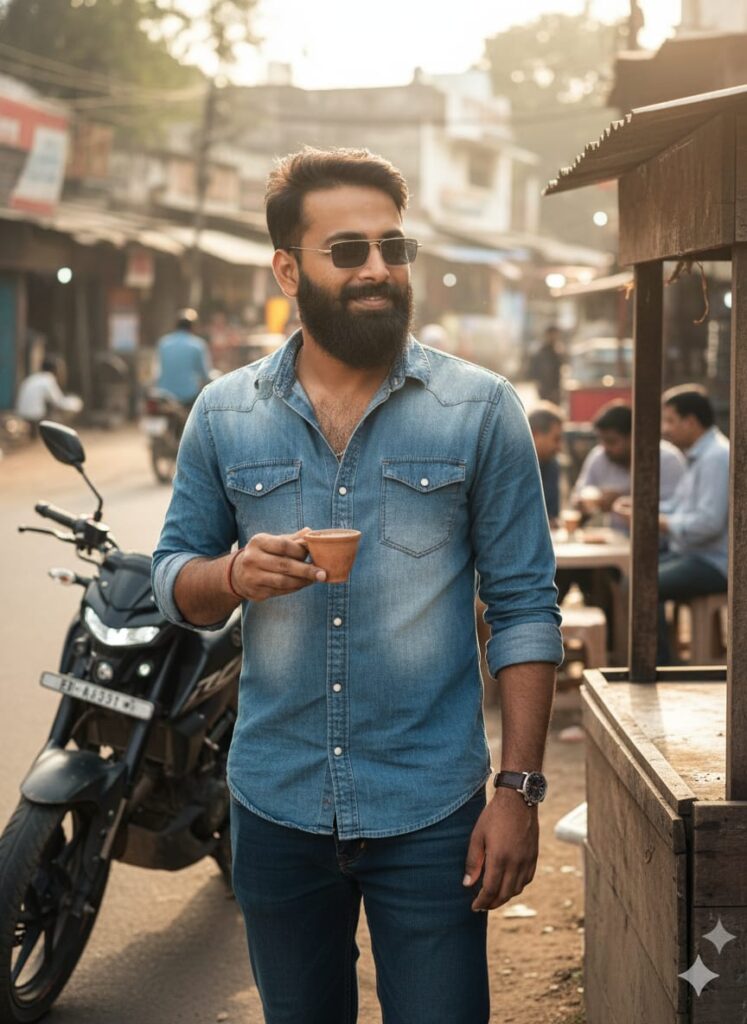 A realistic and cinematic image of a young man, 20-25 years old, with a strikingly handsome face, casually dressed in a denim shirt and jeans. He is wearing a wristwatch on one hand and holding a cup of tea (chai) in the other. He is also wearing stylish sneakers. He has a slight, gentle smile. He is standing by a roadside tea stall on a main road, next to his parked Yamaha MT-15 motorcycle. The tea stall's environment includes a few people sitting and drinking tea in the background. The scene should feature natural, realistic cinematic lighting and be rendered in high-definition (HD) quality. The final image should look absolutely real and lifelike. Don't change faces