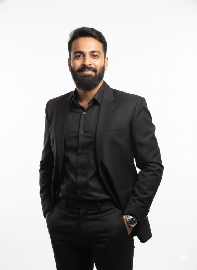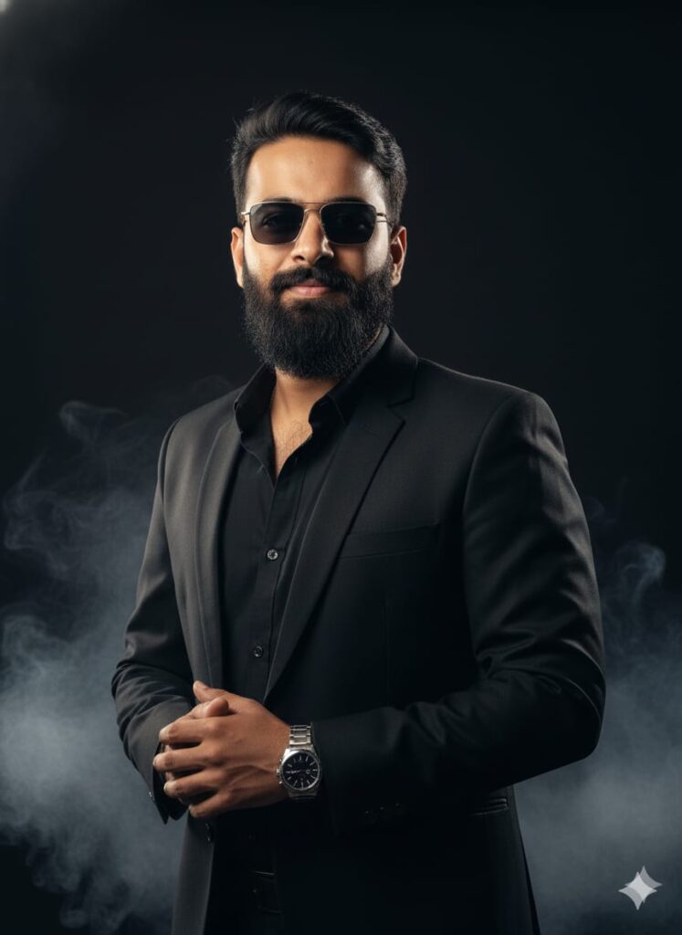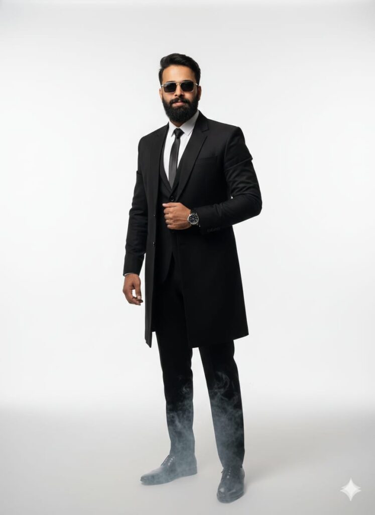 A *hyper-realistic* portrait of a handsome young man, approximately 25 years old. He has a *subtle, engaging smile* and is looking directly at the camera. He is impeccably dressed in a *black formal suit, wearing a **bright, black long blazer/coat* over it, and black formal shoes. He is also wearing *stylish sunglasses* and a *dress watch* on his wrist.
