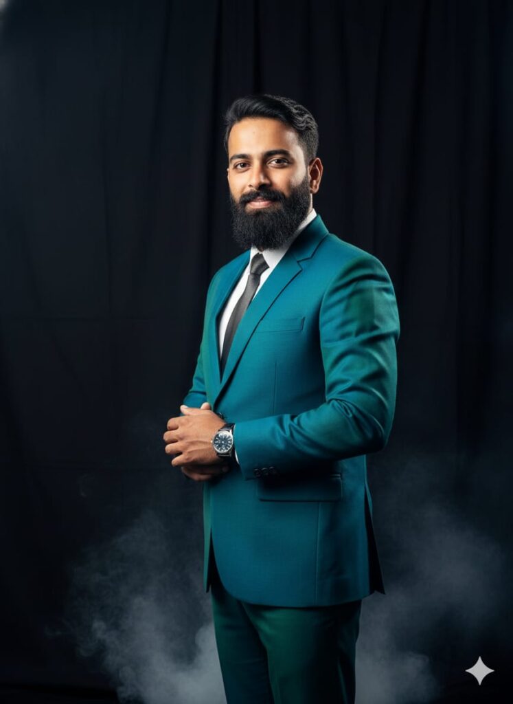 A photorealistic portrait of a handsome young man with a slight smile, looking directly at the camera. He is wearing a formal suit in mixed colors with a bright blazer, formal shoes, and a wristwatch. He is posing slightly to the side, with his hands clasped and gently rubbing them together. The setting is an indoor photoshoot room with a fully black backdrop curtain. There is light smoke near the floor. Full frame, detailed face, cinematic lighting. Don't change faces