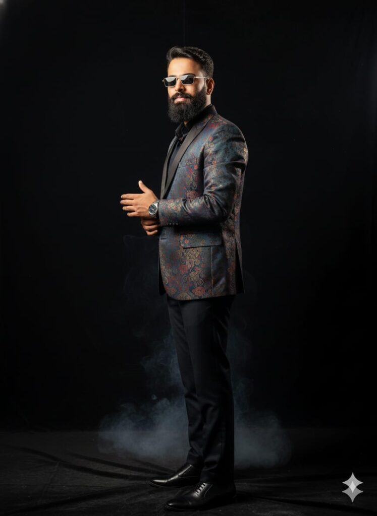 Hyperrealistic, full-frame portrait of a young man, detailed face, captivating gaze, and a subtle smile. He is elegantly dressed in a multi-colored formal suit, a vibrant blazer, and polished formal shoes. He wears a sleek wristwatch and is in a side pose, gently caressing his hands together. The setting is an exclusive indoor photo studio with a fully black velvet backdrop. Light ground-level smoke adds drama. Cinematic lighting, Octane render, 8k, photorealistic. Don't change faces