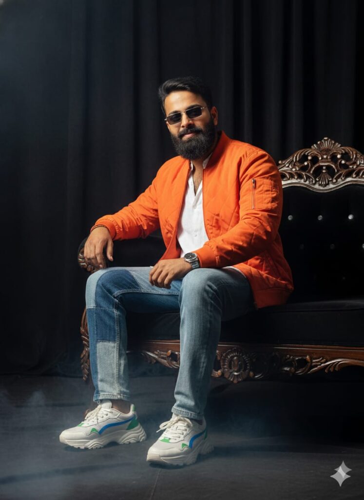 A Hyperrealistic, full-frame portrait of a handsome young man with a unique, detailed face, sporting a subtle smile and looking directly at the camera. He is stylishly dressed in a casual outfit featuring a baggy shirt, mixed-color jeans, and a vibrant, bright jacket. He is wearing cool sneaker shoes, a sleek wristwatch, and sunglasses. He is captured in a captivating side pose, seated on a majestic long king chair. The setting is an exclusive indoor photoshoot studio with a fully black velvet backdrop curtain. Light, atmospheric smoke drifts near the floor. Detailed textures, 8k, photorealism, cinematic lighting. Don't change faces