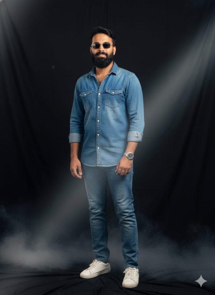 Hyper-realistic photograph of a young man, subtly smiling and looking at the camera. He is wearing a free-size jeans shirt, jeans, sport shoes, sunglasses, and a wristwatch. Full frame shot. Professional indoor photoshoot setup with a fully black backdrop. Subtle smoke/fog on the floor. High detail, volumetric lighting. Don't change faces