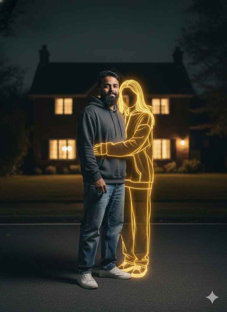 A young man stands on a main road, looking subtly towards the camera with a faint, gentle smile. He is dressed in casual attire: a comfortable t-shirt or hoodie, baggy jeans, and stylish sneakers. From behind, a fully golden, intensely glowing neon ghost-like girl is embracing him with both hands around his waist. She is similarly dressed in casual clothes and shoes. The background features the front garden of a house, with the main road in the foreground. The garden is under dark, moody lighting, but there are lights actively glowing from inside the house, casting warm illumination through windows. The young man's face is in sharp focus and rendered in high-definition (HD) quality, contributing to a mysterious yet inviting atmosphere. Cinematic, hyper-detailed, strong golden glow, dramatic atmospheric lighting with contrasting interior house lights, ethereal embrace. Don't change faces