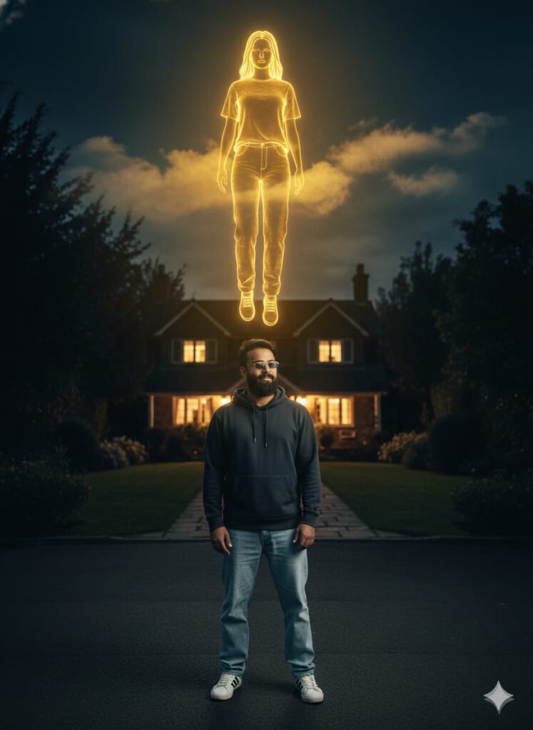 A young man stands on a main road, looking subtly towards the camera with a faint, gentle smile. He is dressed in casual attire: a comfortable t-shirt or hoodie, baggy jeans, and stylish sneakers. Floating majestically in the sky above him, at a slight distance, is a 20-year-old, fully golden, intensely glowing neon ghost-like girl. She is similarly dressed in casual clothes and shoes. The background features the front garden of a house, with the main road in the foreground. The garden is under dark, moody lighting, but there are lights actively glowing from inside the house, casting warm illumination through windows. The young man's face is in sharp focus and rendered in high-definition (HD) quality, creating a mysterious, awe-inspiring, and ethereal scene.…