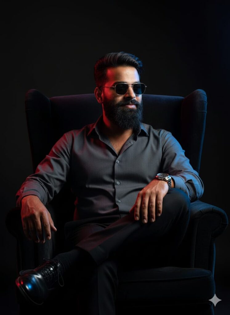 - Talking about this photo, you are wearing a grey shirt and black pants, which gives a very nice look. He is sitting with his legs crossed, holding a watch in his hand, and the side view is in the background. The black side has a red-blue effect.