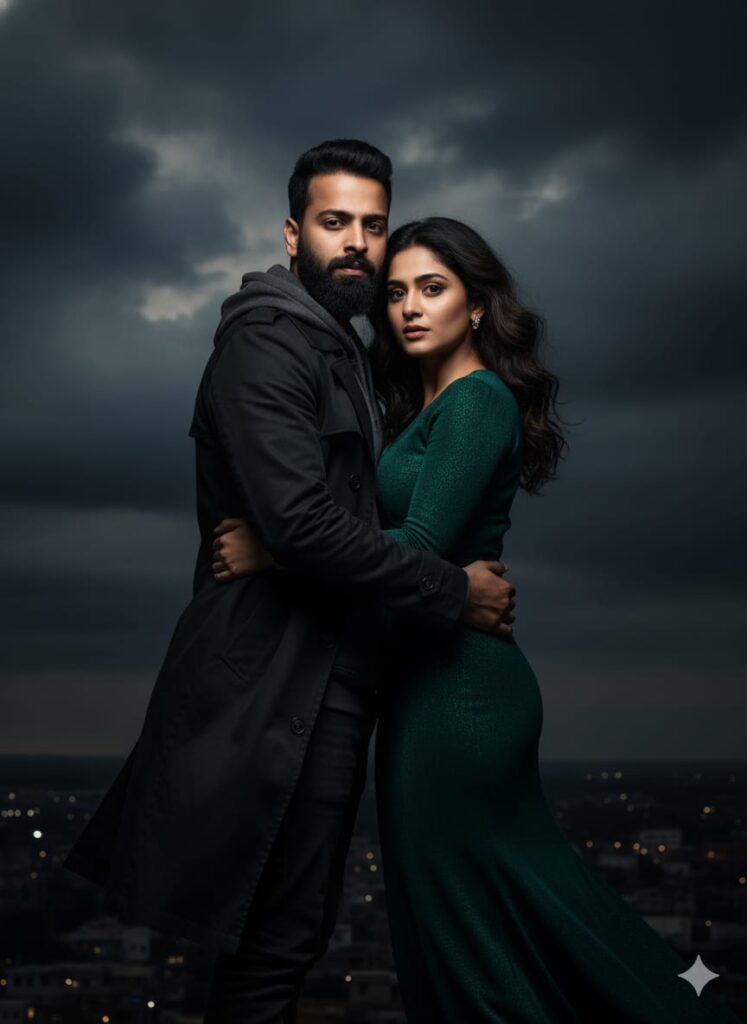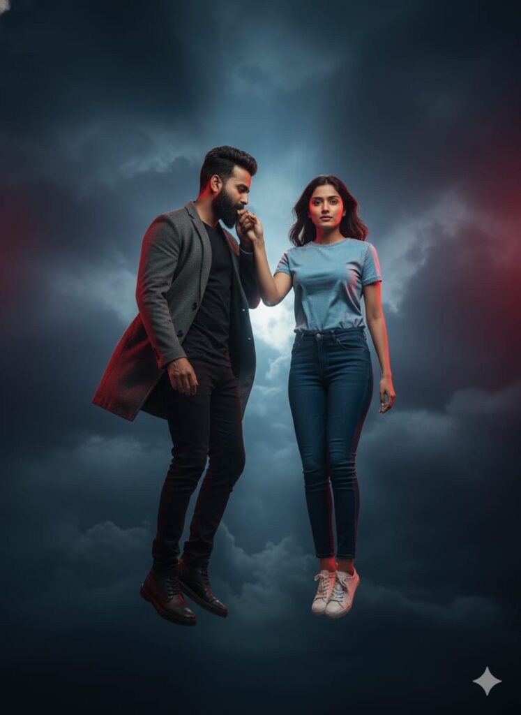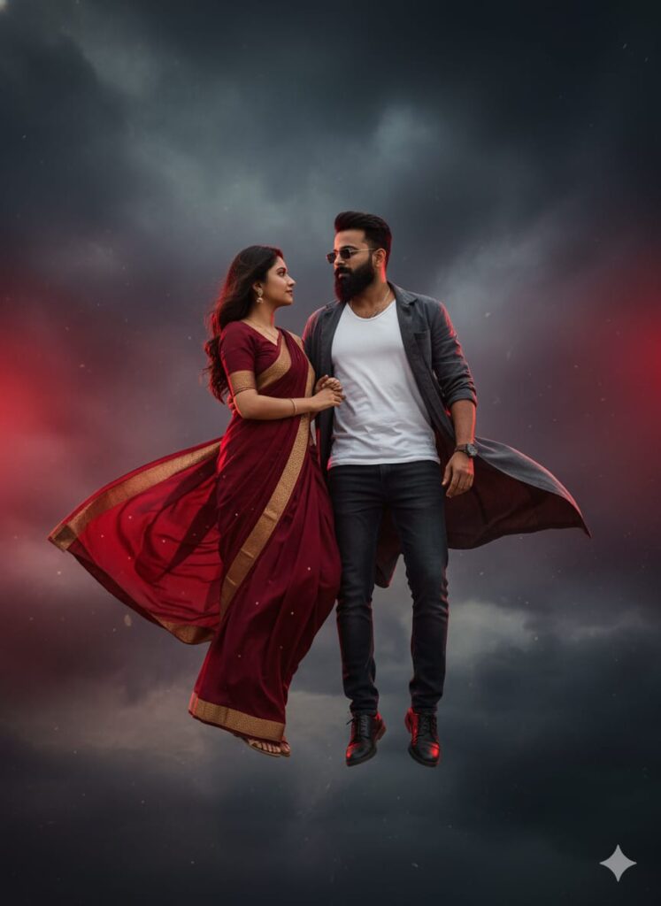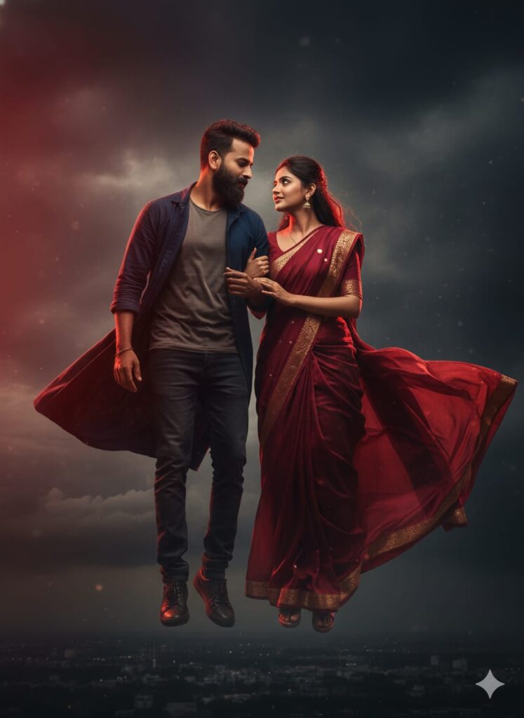 "A photorealistic, cinematic full-body portrait of a young couple suspended in the sky. The young man has a realistic, highly detailed face, and is dressed in a casual outfit with a long jacket. The young woman, wearing an elegant, flowing long saree, is gazing lovingly into his eyes in a romantic pose. The background features a dark, moody atmosphere with dramatic red side lighting. Cinematic lighting, volumetric light, ultra-HD, 8K, with clear and sharp facial details and expressions." Don't change faces