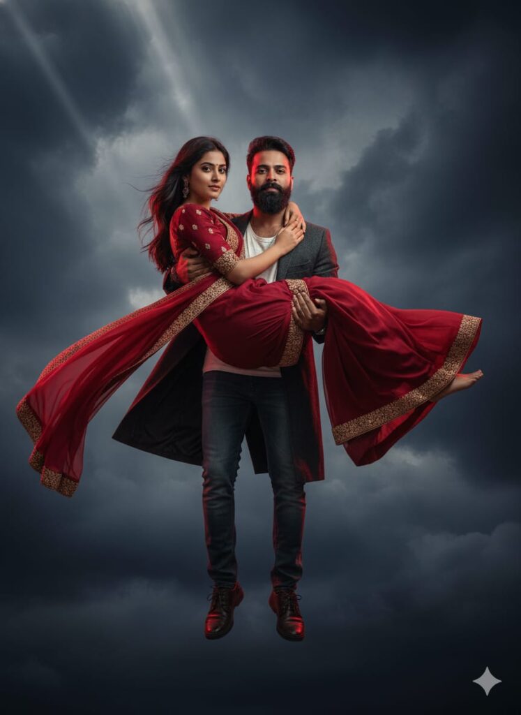 "A photorealistic, cinematic full-body portrait of a young couple suspended in the sky. The young man, with a realistic, highly detailed, replaceable face, is holding the young woman tenderly in his arms. He is dressed in a casual outfit with a stylish long jacket. The young woman is wearing an elegant, flowing long saree. Both are looking directly forward, maintaining a romantic and intimate pose. The background features a dark, moody atmosphere with dramatic red side lighting. Cinematic lighting, volumetric light, ultra-HD, 8K, with clear and sharp facial details and expressions." Don't change faces